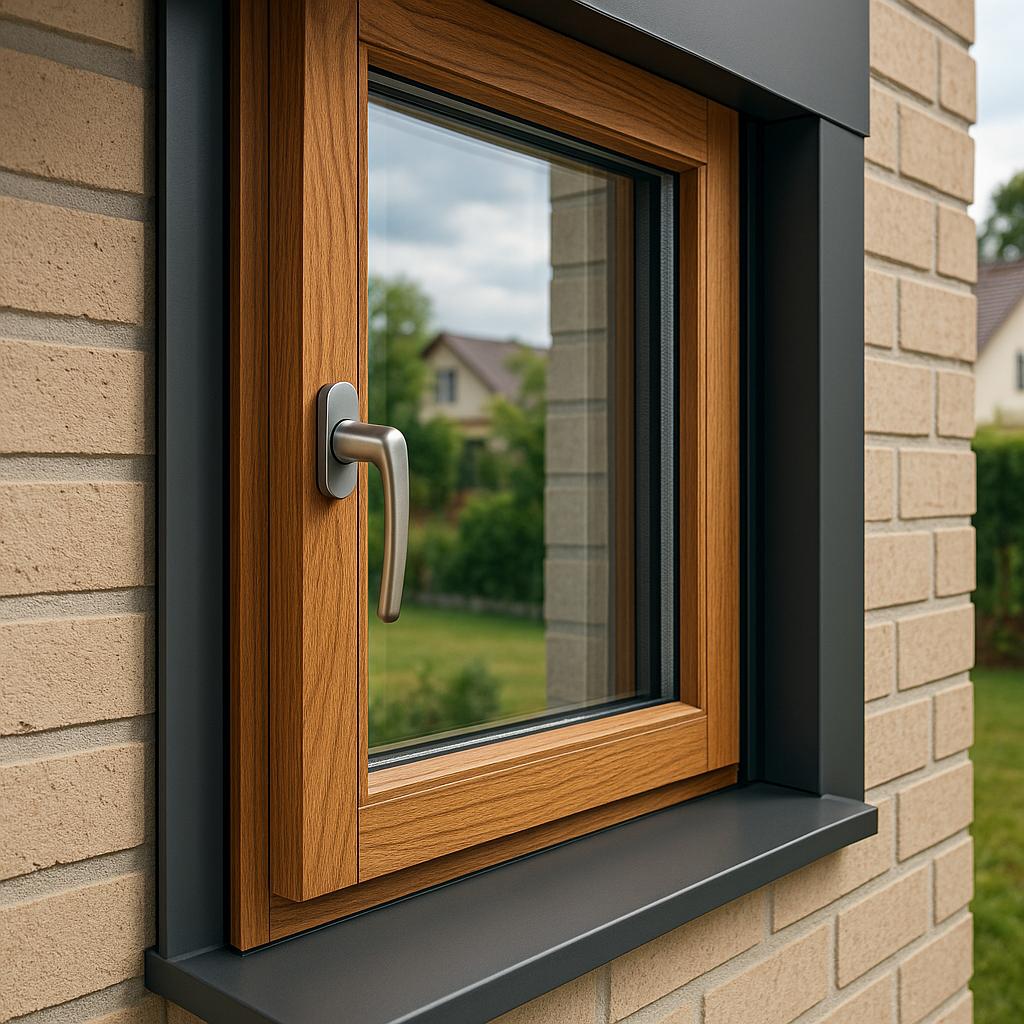 Деревянная часть может быть выполнена в натуральных оттенках: дуб, орех, мореный дуб — с сохранением видимой структуры древесины. А алюминиевая оболочка доступна в любом цвете по каталогу RAL, включая популярные антрацит, чёрный, тёплый коричневый или даже имитацию металлика. Это позволяет идеально вписать окна в архитектуру любого здания от классического особняка до современного лофта.