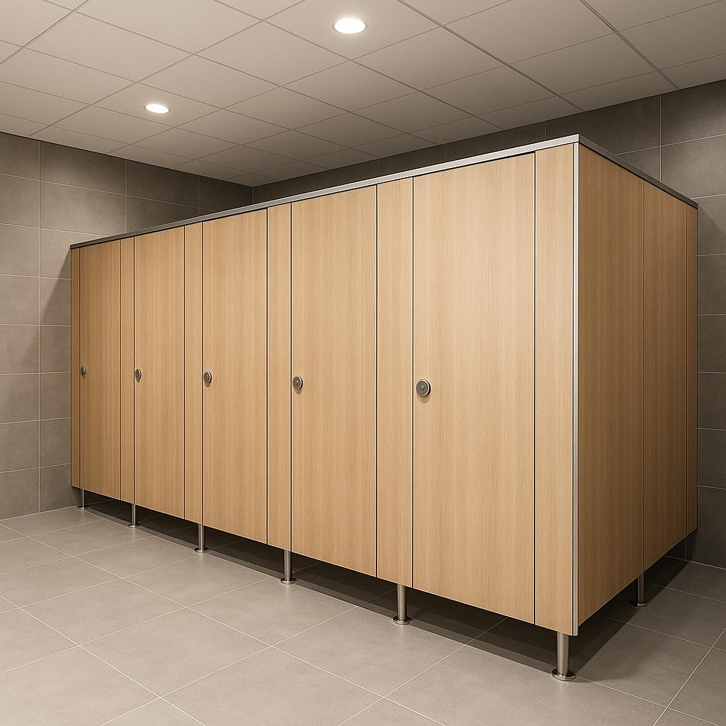 Решение: компакт-ламинат, антивандальная фурнитура, схема на опорах или подвесная для ускорения уборки, ярко читаемая навигация, матовые поверхности.